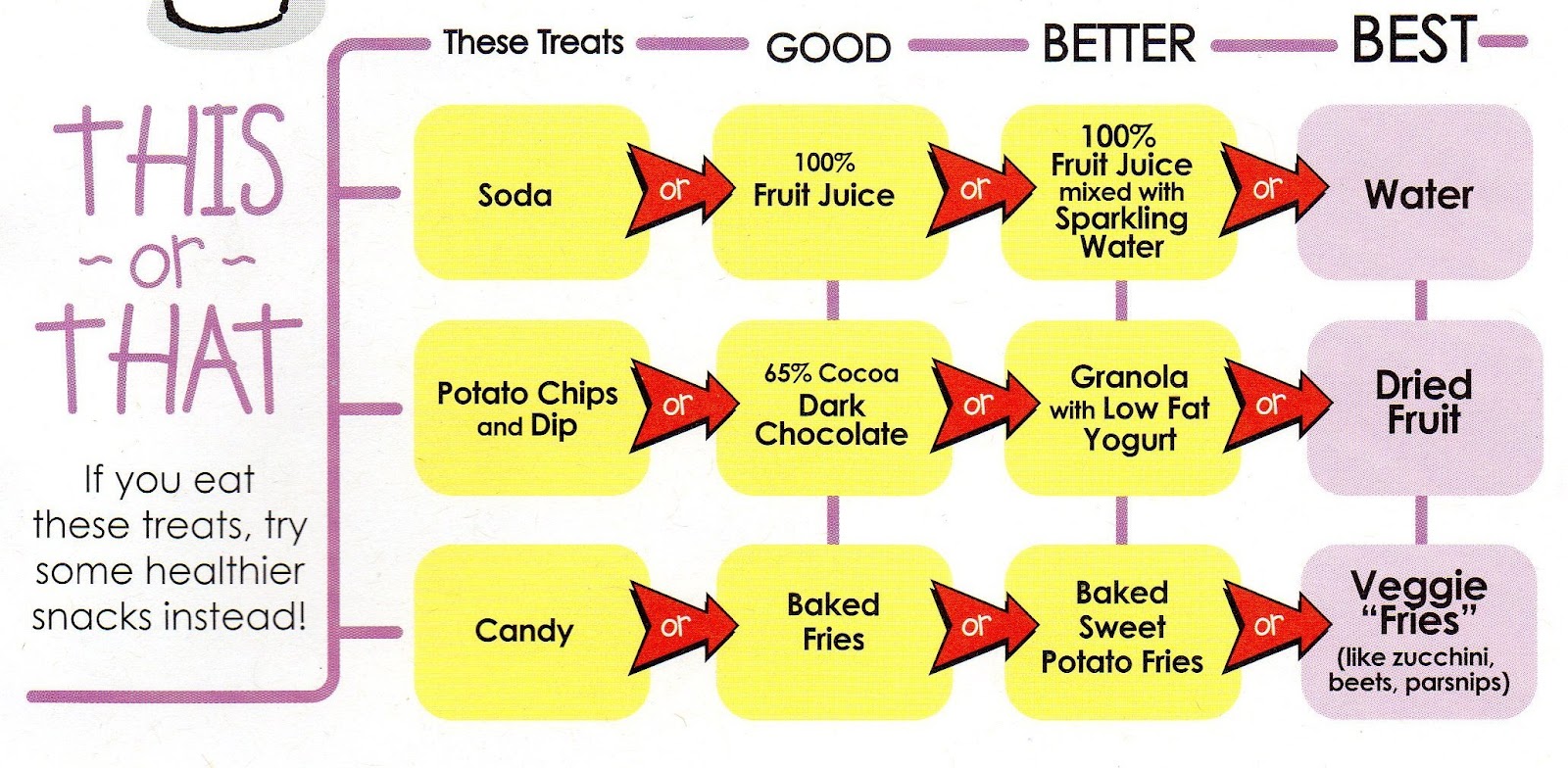Are you trying to get into shape for your wedding day? Or stay in shape after your wedding? Here are some easy choices. The left column are to be avoided at all costs, and the suggestions for replacement snacks improve from left to right.